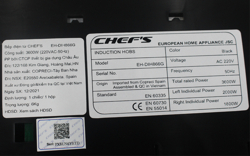 Thông tin bếp từ Chefs EH DIH866G
