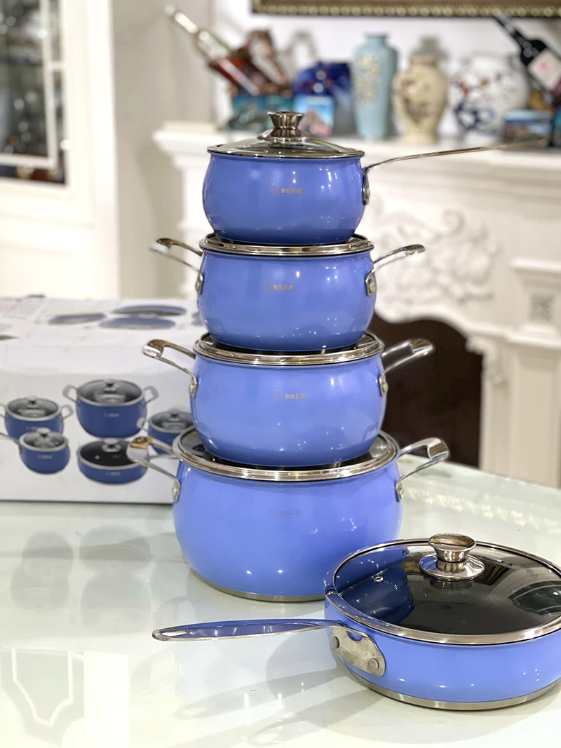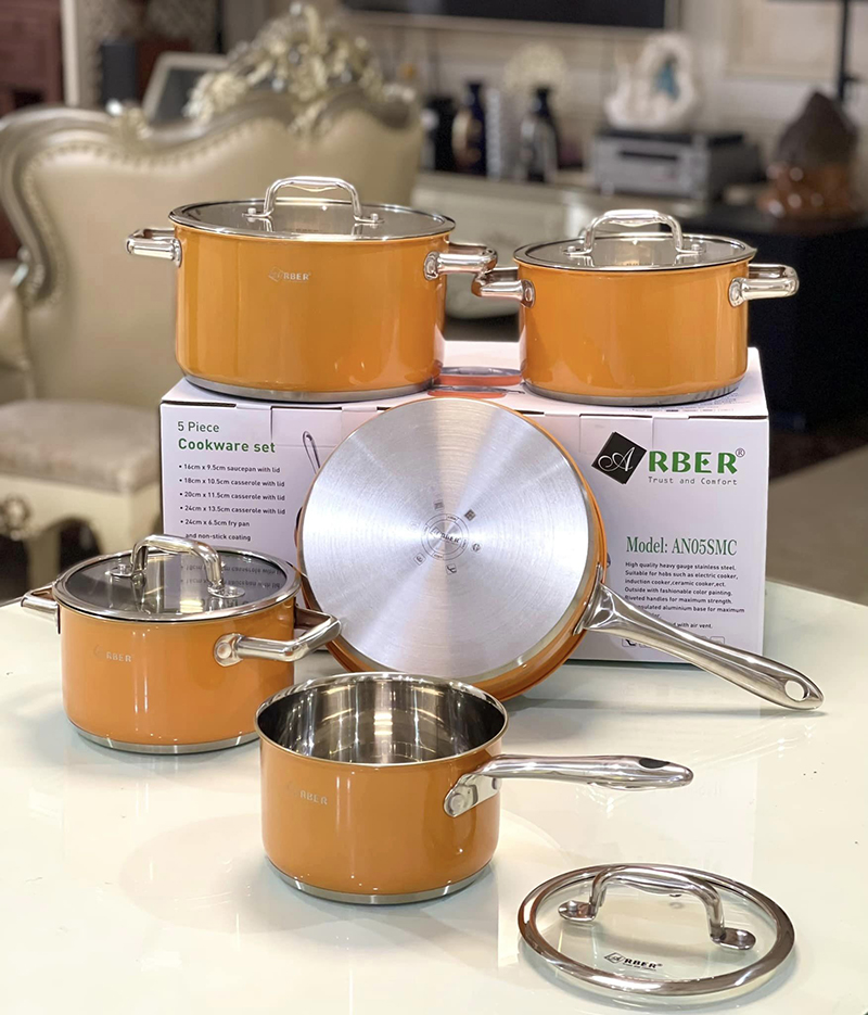 Bộ nồi Arber AN05SMC (4 nồi + 1 chảo) có màu cam rất nổi bật và bắt mắt.