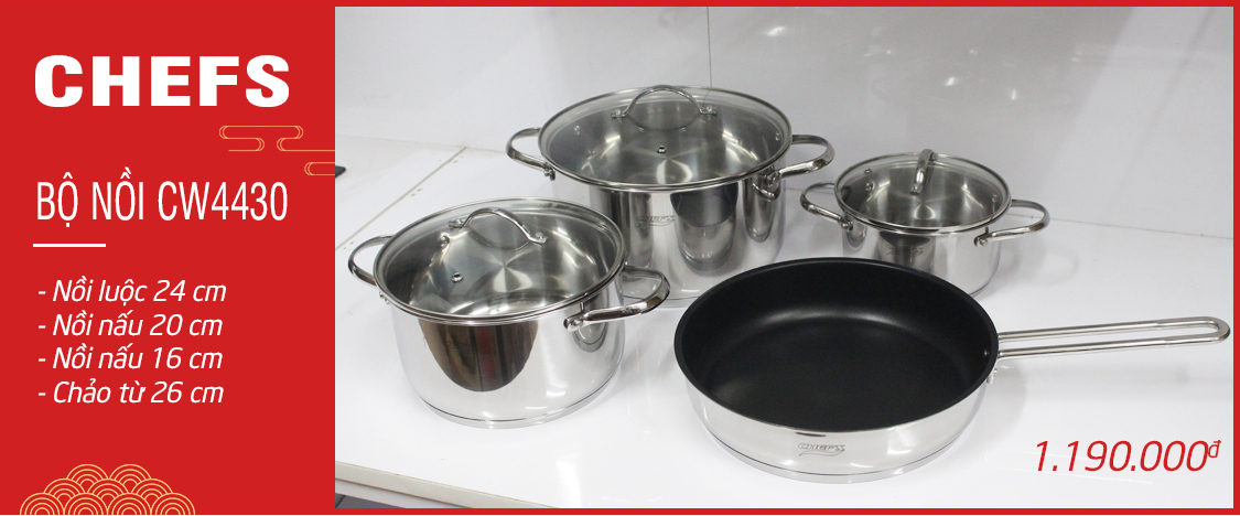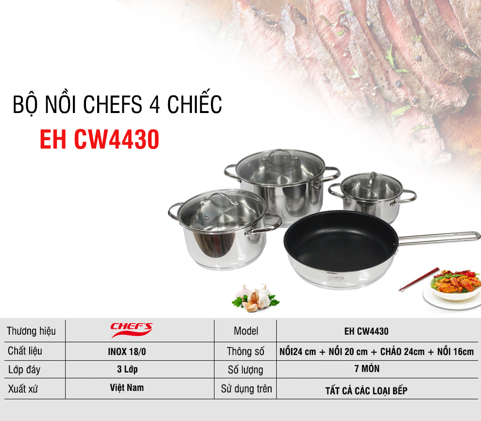Bộ nồi từ 4 chiếc cao cấp Chef’s làm bằng chất liệu thép không gỉ, đáy bộ nồi 3 đáy siêu bền khi sử dụng, bộ nồi tiếp xúc nhiệt nhanh, tản nhiệt đều khi nấu