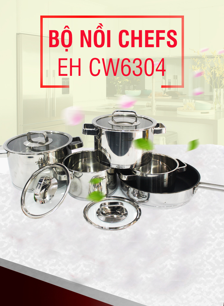 Bộ nồi từ 5 chiếc cao cấp Chef’s làm bằng chất liệu inox 304, thiết kế đáy 3 lớp siêu bền khi sử dụng. Bộ nồi tiếp xúc nhiệt nhanh, tản nhiệt đều khi nấu, đang được bán với giá tốt nhất trên thị trường. Bộ sản phẩm chuẩn: + 01 nồi 24cm + 01 nồi 20cm + 01 nồi 18cm + 01 nồi 16cm + 1 chảo 26cm