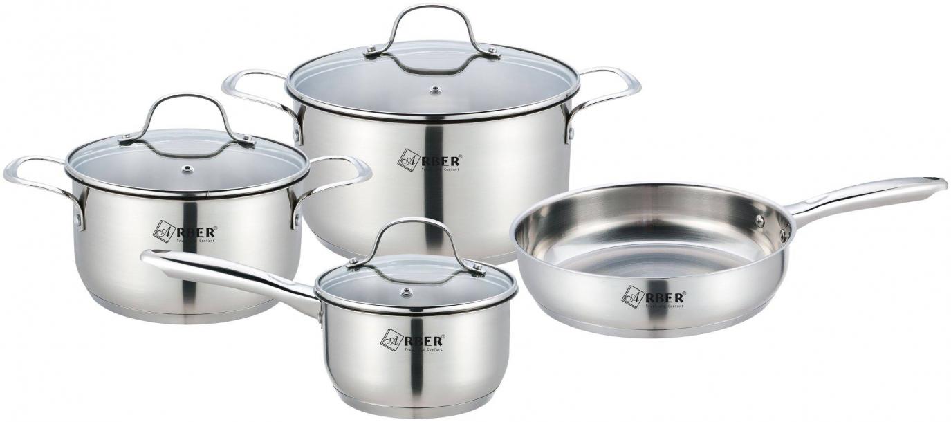 Bộ nồi từ chảo 4 chiếc cao cấp ARBER làm bằng chất liệu thép không gỉ, đáy bộ nồi 3 đáy siêu bền khi sử dụng, bộ nồi tiếp xúc nhiệt nhanh, êm, tản nhiệt đều khi nấu.