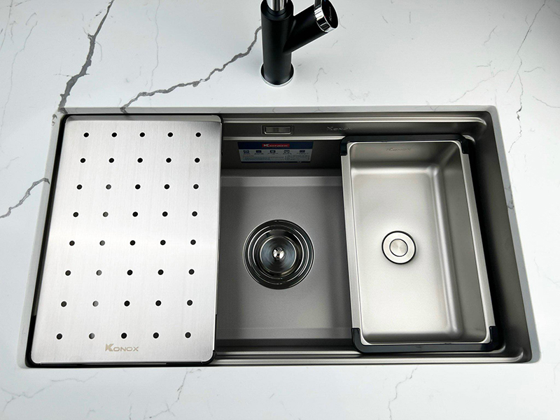 - Thiết kế hiện đại với gờ hạ bậc – tích hợp phụ kiện thông minh: Siphon, giá úp bát inox, chậu rửa nhỏ, thớt inox, thớt inox lỗ
