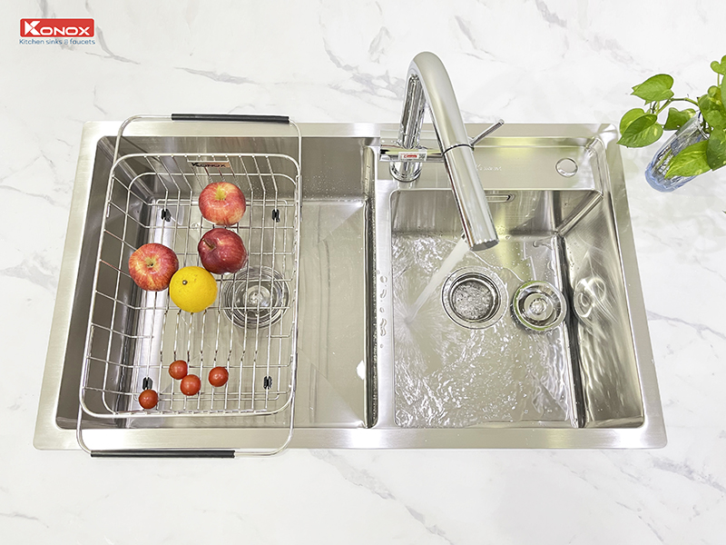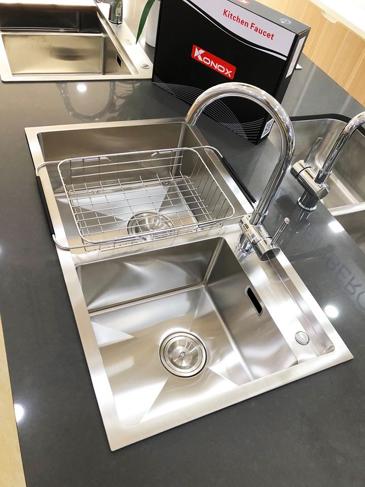 - Thiết kế 2 hố rửa lệch nhau, "bậc thang" tiện dụng lắp đặt và sử dụng