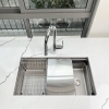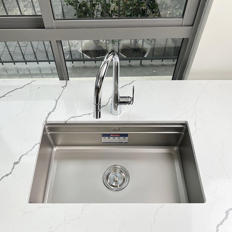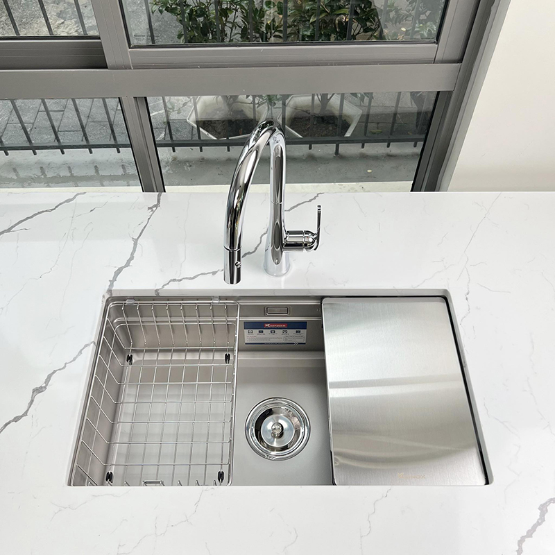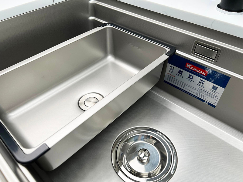 - Thiết kế hiện đại với gờ hạ bậc – tích hợp phụ kiện thông minh: Siphon, giá úp bát inox, chậu rửa nhỏ, thớt inox, thớt inox lỗ