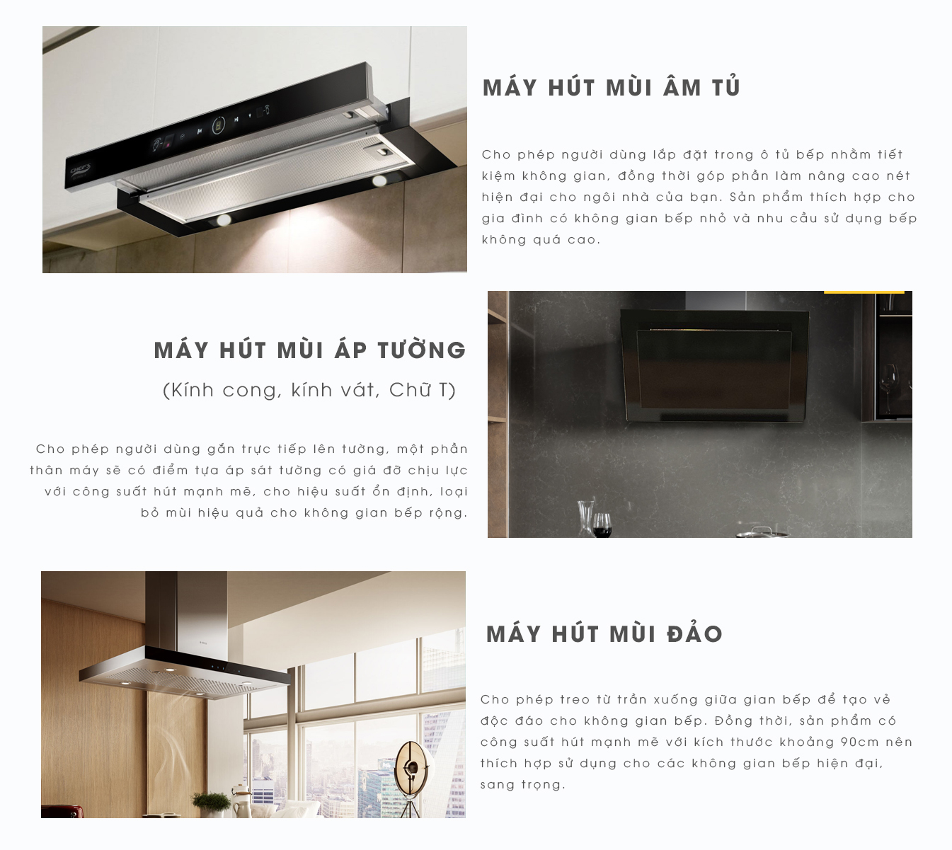 Việc bạn lựa chọn kiểu dáng của chiếc hút mùi, nó sẽ quyết định đến thiết kế của các không gian bếp đó và nó cũng quyết định luôn kiểu dáng của tủ bếp mà bạn muốn lắp cho gia đình. Hiện nay trên thị trường có 3 kiểu dáng máy hút mùi cơ bản, phổ biến nhất, sở hữu những ưu nhược điểm khác nhau để đáp ứng nhu cầu sử dụng đa dạng: