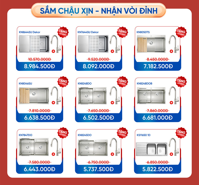 - Tặng thêm vòi rửa bát dây rút Reno hoặc Pote Chrome.