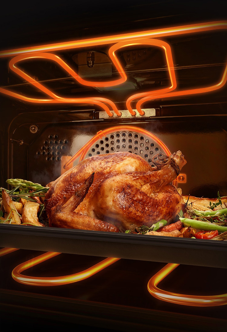Lò nướng sử dụng tính năng nướng điện trở với 2 thanh nhiệt trên và 1 thanh nhiệt dưới, cùng quạt đối lưu giúp nhiệt lượng được tỏa đều khắp lò, làm nóng thức ăn, an toàn và đẹp mắt.