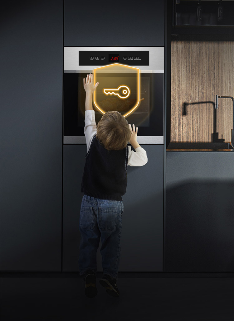 - Khóa an toàn trẻ em: Lò có khóa an toàn đối với trẻ em. Khi nhận được lệnh, bảng điều khiển sẽ bị vô hiệu hóa, đảm bảo người dùng có lỡ chạm vào cũng không nguy hiểm.