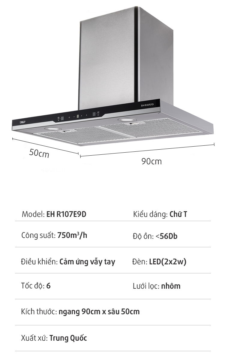 Máy hút mùi EH-R107E9D có thiết kế dạng chữ T nhỏ gọn, bề mặt phủ kính cường lực hiện đại, sang trọng dễ dàng vệ sinh