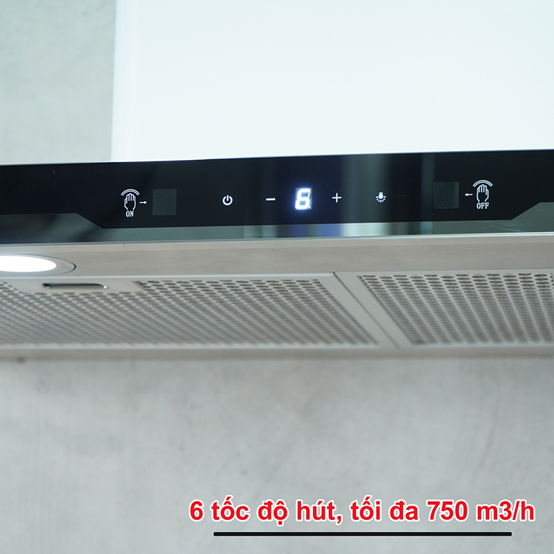 Máy có công suất hút mạnh mẽ, lên đến 750 m3/h, hút siêu nhanh, bếp sạch mùi nhanh chóng, cho không gian bếp luôn thoáng.