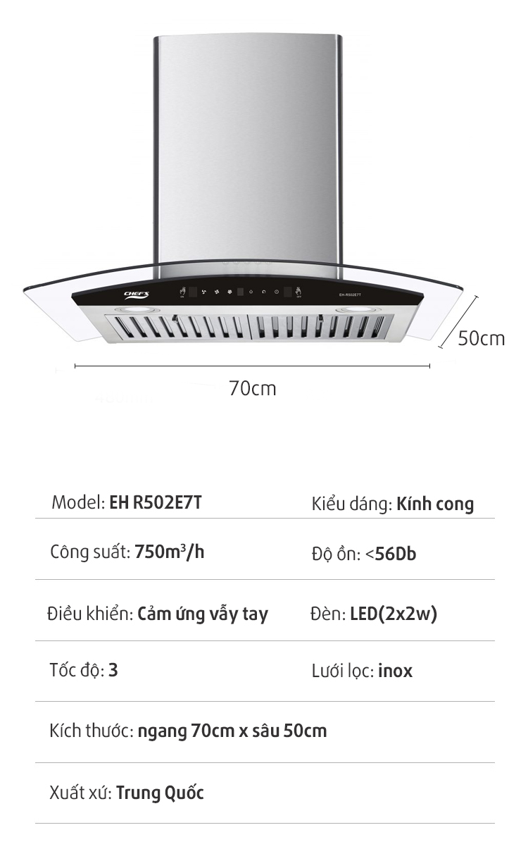 Model máy hút mùi Chefs EH R502E7T được thiết kế với phong cách hiện đại, sang trọng nhưng lại mang tính phổ thông cao phù hợp cho đại đa số không gian nhà bếp tại Việt Nam. Với kích thước ngang mặt kính là 700mm việc thiết kế tủ bếp và lắp đặt máy sẽ trở nên dễ dàng và ăn khớp với không gian bếp hơn. Và đây cũng là kích thước máy hút mùi phổ biến nhất tại Việt Nam.