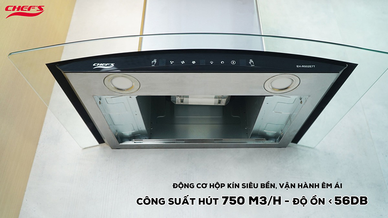 Model máy hút mùi chefs EH R502E7T được trang bị loại động cơ hộp kín với công suất động cơ 198W nhưng có thể tạo ra áp lực gió tối đa tới 360 Pa, hút sạch mọi khói bụi, hơi dầu mỡ khi nấu ăn. Một điều đặc biệt của thế hệ động cơ này là tạo ra tiếng ồn nhỏ, không gây khó chịu cho người sử dụng như các lạo máy hút mùi thông thường trên thị trường hiện tại.