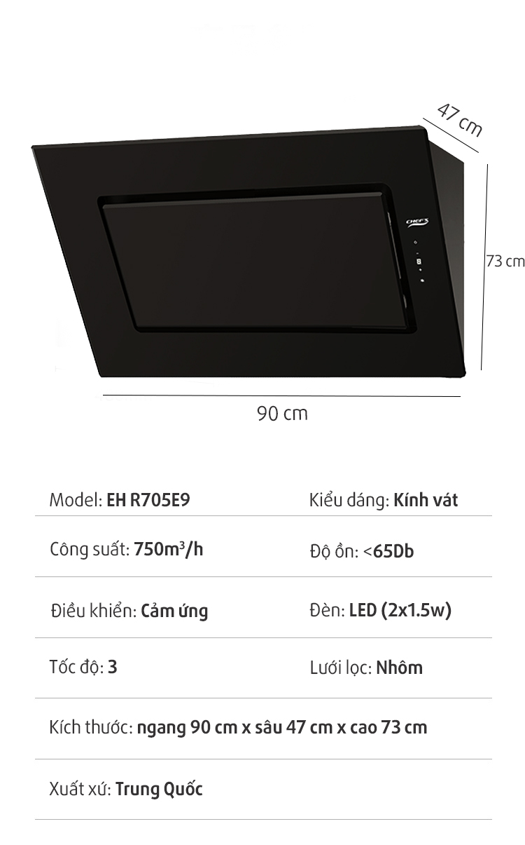 Máy hút mùi R705E9 có công suất hút lớn nhưng độ ồn tối đa chỉ 65dB, không gây cảm giác khó chịu về tiếng ồn khi sử dụng.