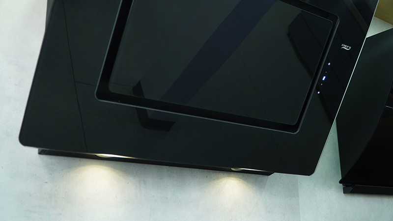 Máy hút mùi R705E9 có thiết kế dạng kính gắn tường độc đáo, màu đen sang trọng, tăng tính thẩm mỹ cho gian bếp.