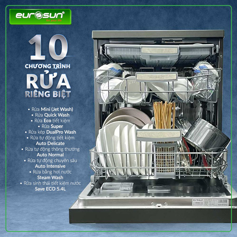 - Rửa Quick Wash nhanh 30 phút 40°C, Rửa Eco 68°C - Rửa cực mạnh làm sạch nhanh Supper 55' 65°C - Rửa kép DualPro Wash 60°C - Rửa tự động tiết kiệm Auto Delicate 30°C - 50°C - Rửa tự động thông thường Auto Normal 50- 60°C/ Auto Flex 50- 60°C - Rửa tự động chuyên sâu Auto Intensive 60°C - 70°C - Rửa Quick Wash nhanh 30 phút 40°C, Rửa Eco tiết kiệm, 68°C - Rửa cực mạnh làm sạch nhanh Supper 55' 65°C - Rửa kép DualPro Wash 60°C - Rửa bằng hơi nước Steam Wash - Rửa sinh thái tiết kiệm nước Save ECO 5.4L |