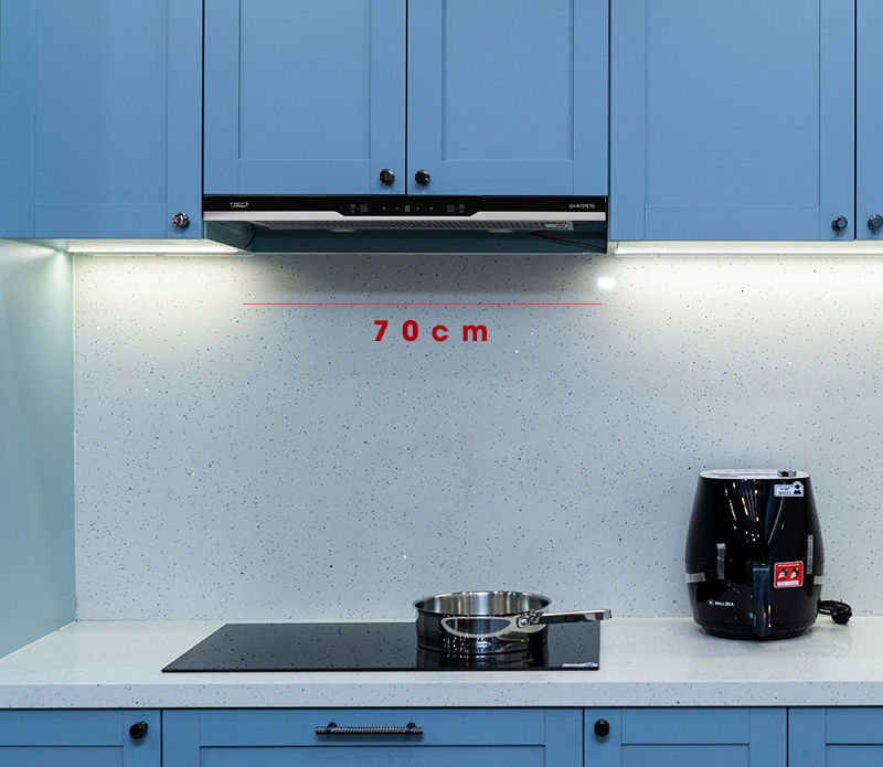 Những mẫu máy hút mùi có kích thước ngang 70cm sẽ thích hợp với những căn bếp có không gian từ nhỏ đến vừa của các căn nhà riêng hoặc các căn hộ nhà chung cư hiện nay, bên trên không gian lắp đặt hút mùi thì bạn có thể thiết kế tủ bếp hoặc để trống. Các kiểu dáng phổ biến của máy hút mùi kích thước 70cm gồm có: máy hút mùi kính cong 70cm, máy hút mùi rút âm tủ 70cm, máy hút mùi chữ T 70cm, máy hút mùi kính vát 70cm.