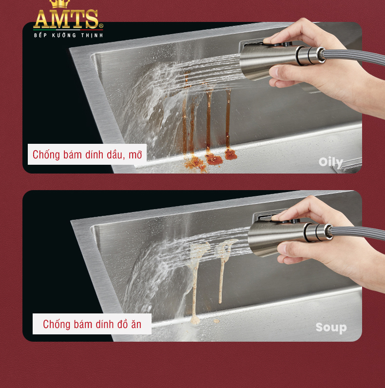 Bề mặt của chậu rửa bát AMTS được xử lý với công nghệ đánh bóng mịn các góc cạnh được xử lý tinh xảo, làm tăng khả năng chống bám dính dầu mỡ dễ dàng vệ sinh. Bề mặt đáy chậu được thiết kế rãnh thoát nước thông minh giúp thoát nước nhanh và giữ bề mặt chậu khô ráo, các góc cạnh bo tròn dễ dàng vệ sinh hơn.