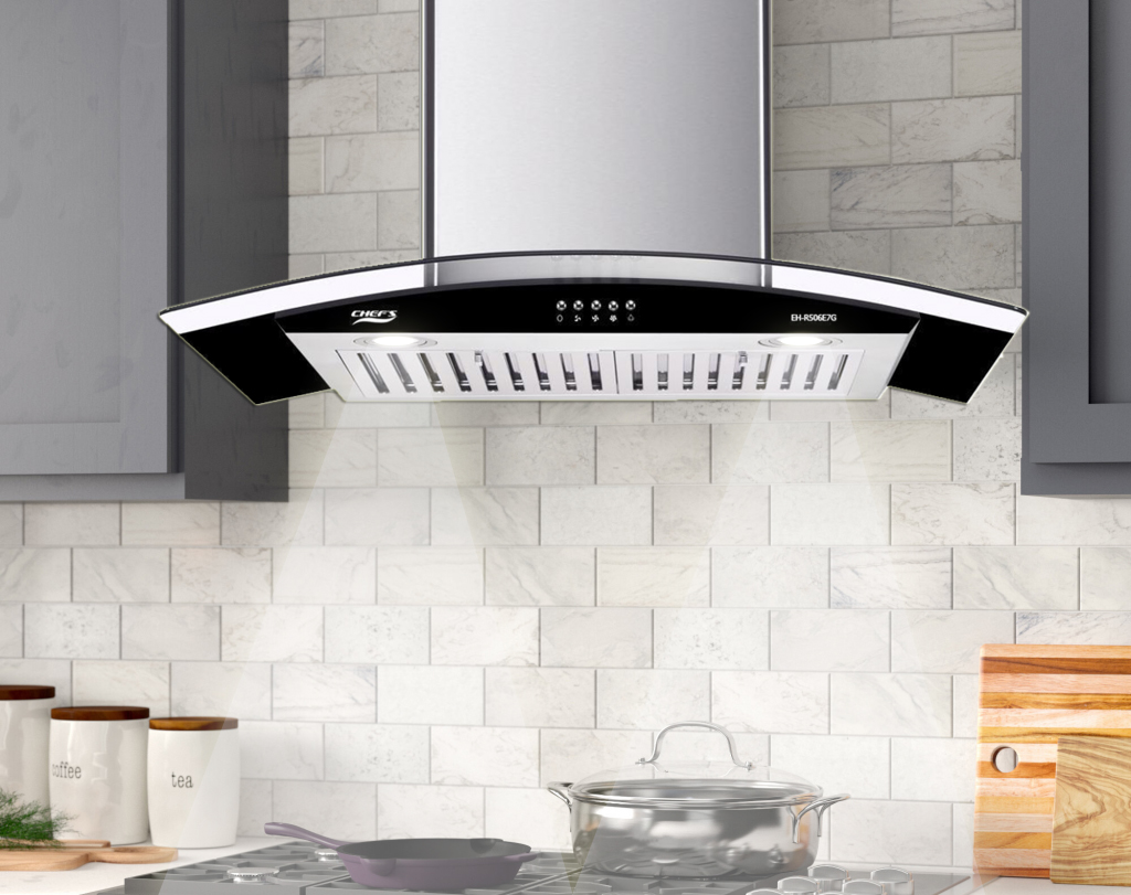Máy hút mùi Chefs EH R506E7G chất liệu kính cong size 70cm sang trọng, kích thước rộng bao trùm toàn bộ bếp nấu, hoạt động hiệu quả. Thân máy bằng chất liệu thép không gỉ bền bỉ, sáng bóng, mới lâu, dễ lau chùi.