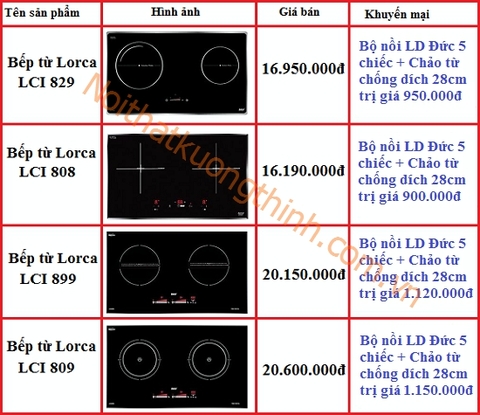 Dưới đây là bảng báo giá bếp từ Lorca mới nhất mà Nội Thất Kường Thịnh cập nhập trong tháng 5 vừa qua để khi bạn mua bếp từ Lorca có thể tham khảo so sánh giá bán giữa các cửa hàng với nhau để có thể mua được một chiếc bếp từ Lorca vừa ý với giá tốt nhất!