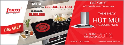 Nội dung chương trình. Giảm giá chiết khấu 10% / giá bán lẻ cho khách hàng khi mua bếp từ LCI 808 hoặc LCE 808. Tặng 01 máy hút TA 2001A/70cm (Nếu khách hàng không lấy máy hút được trừ tối đa 2.000.000 vnđ)