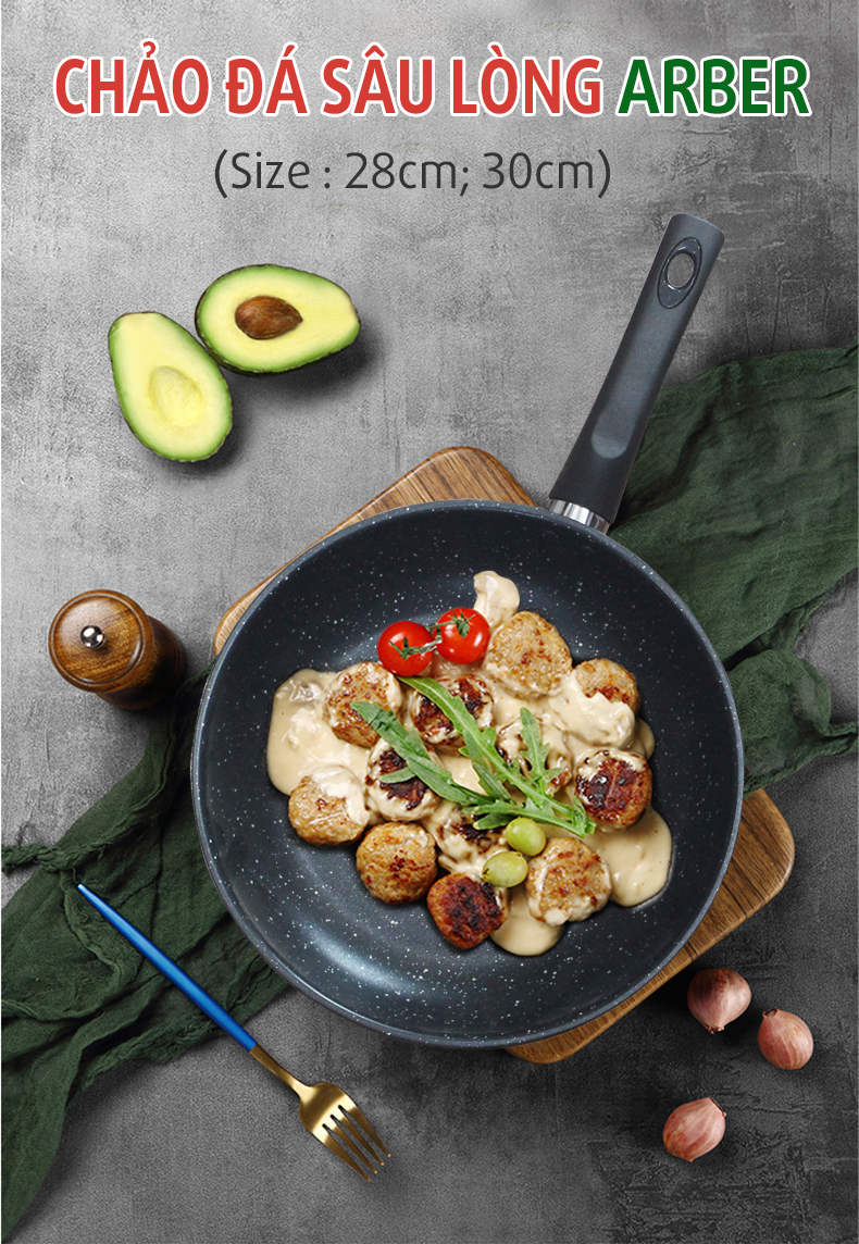 Chảo đá sâu lòng Arber là một sản phẩm mới đến từ thương hiệu Arber, có thể sử dụng được trên mọi loại bếp thông dụng hiện nay là bếp từ, bếp hồng ngoại, bếp gas...Thiết kế lòng sâu tiện dụng giúp bạn chiên xào mà không lo thức ăn bị văng ra ngoài như các mẫu chảo có lòng nông. Bề mặt của chảo được phủ lớp chống dính vân đá cao cấp Xylan Plus có khả năng chống dính cực cao, chịu mài mòn tốt, độ bền cao và đặc biệt an toàn tuyệt đối cho người sử dụng.