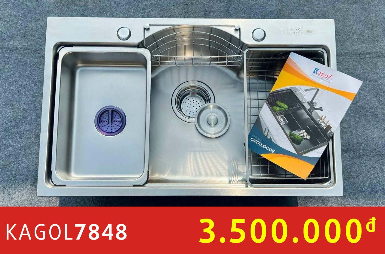 Chậu rửa bát Kagol 7848 sở hưu một thiết kế khá độc đáo, với phần chính giữa được làm bán nguyệt cong để lắp thêm giá phụ để đồ cọ bát...Kích thước chậu dài 78cm x 48cm, độ dày inox đến 3.2mm.