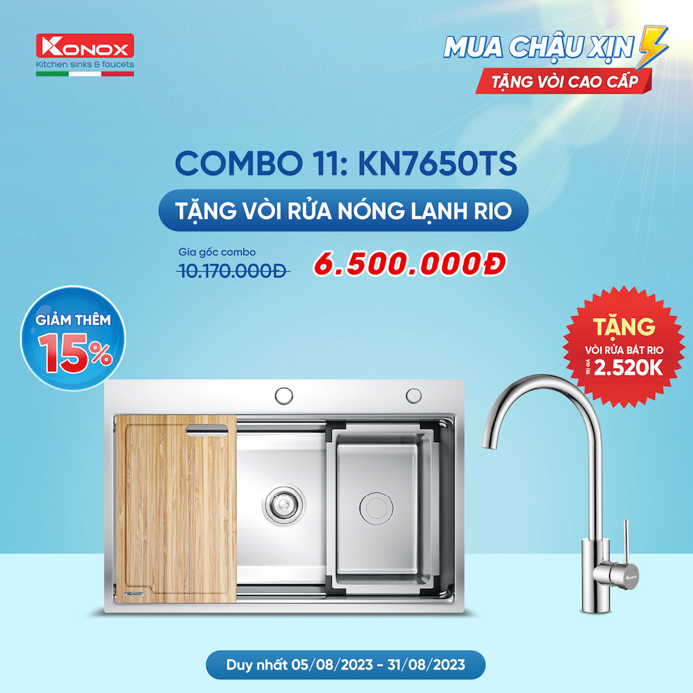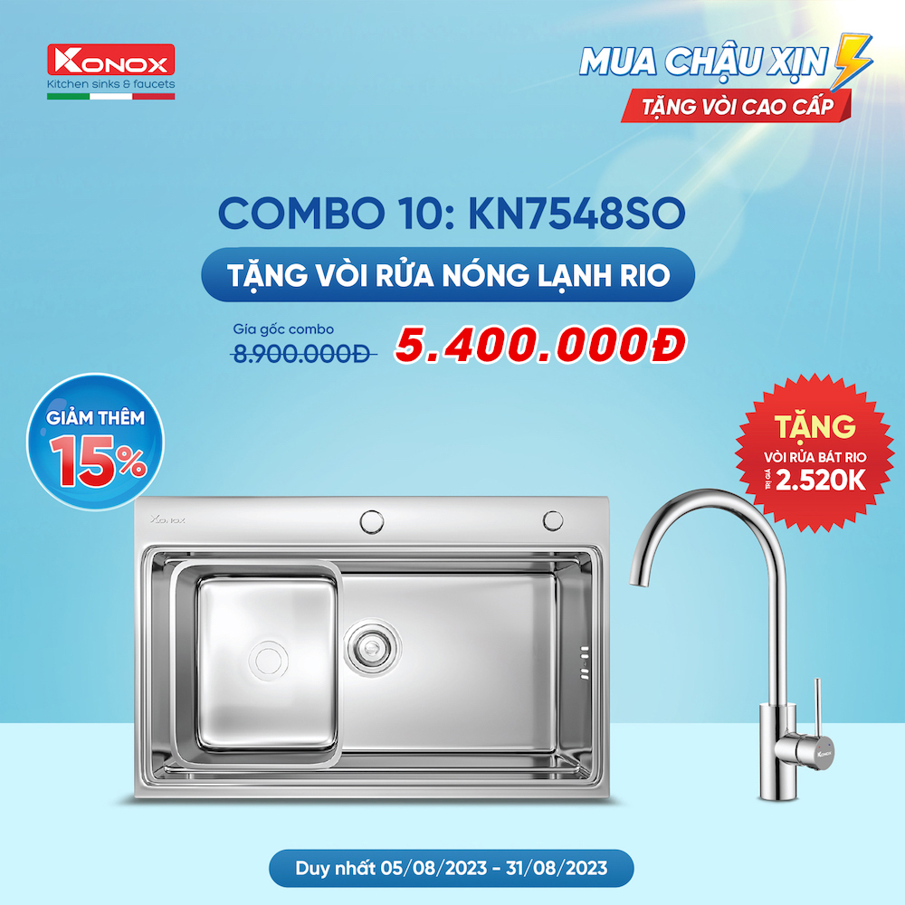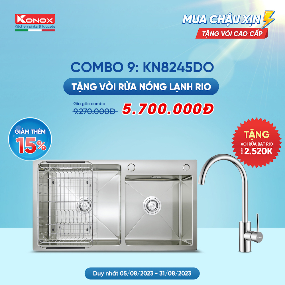 - Khuyến mãi: Tặng kèm vòi rửa bát nóng lạnh Konox Rio.
