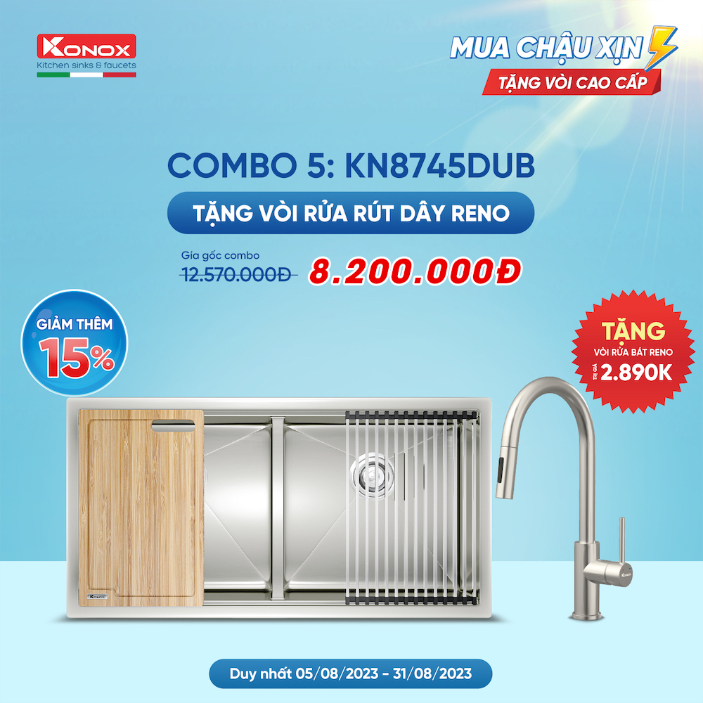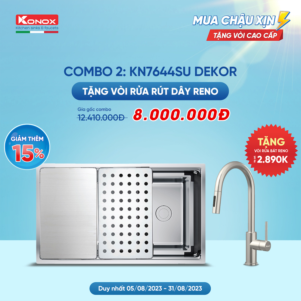 - Khuyến mãi: Tặng kèm vòi rửa bát dây rút Konox Reno.